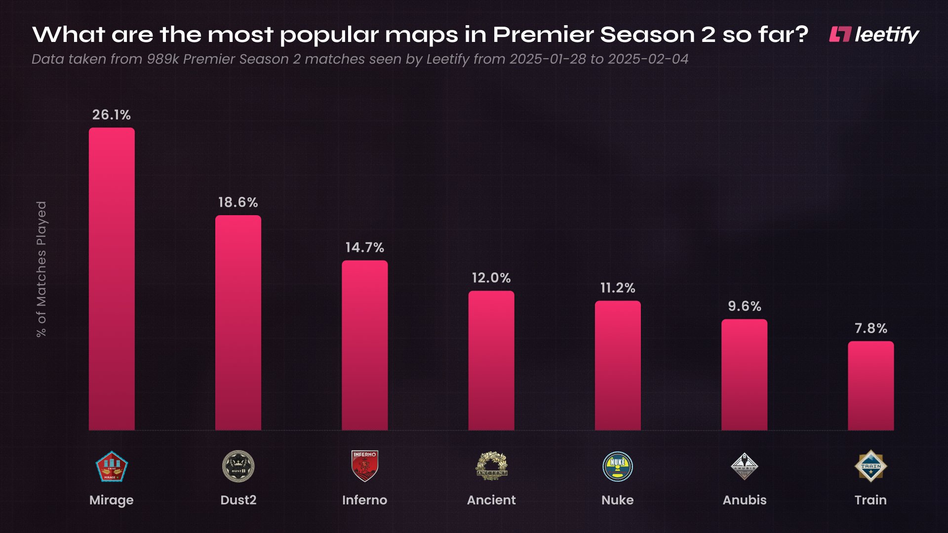 Самой популярной картой второго сезона является Mirage – 26,1% матчей. В топ-3 по этому показателю также входят Dust 2 (18,6%) и Inferno (14,7%).
