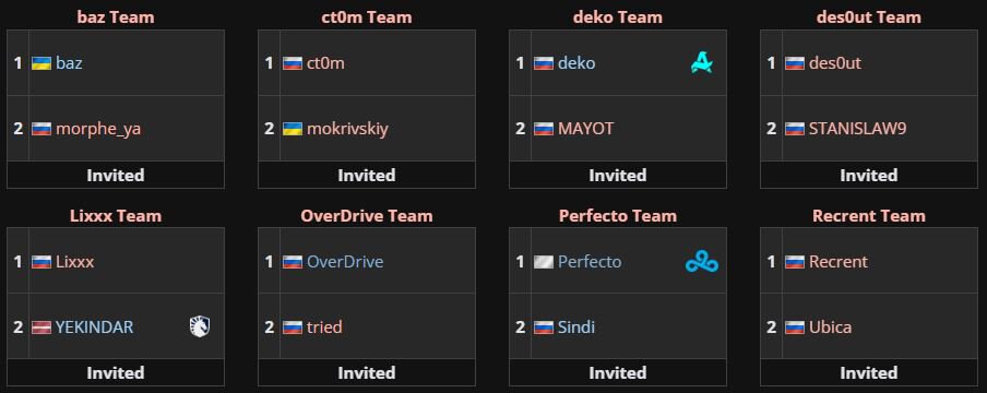 Участники турнира: Ct0m & Mokrivskyi, Deko & Mayot, Perfecto & Sindi, OverDrive & Tried, Baz & Morphe_ya, Lixxx & Yekindar, Recrent & Ubica, Desout & Stanislaw9.