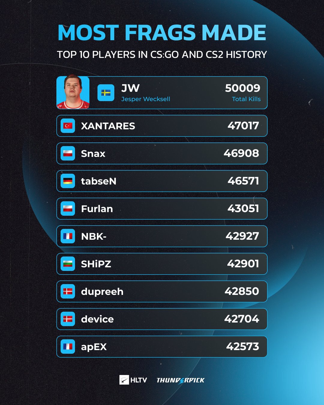 Йеспер «JW» Вексель стал первым игроком на HLTV, который сделал 50 тысяч фрагов. Этот показатель покорился ему в матче против Jano на YaLLa Compass Winter.