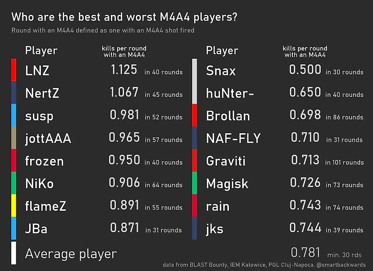 Статистикой лучших и худших рифлеров с M4A4 и M4A1-S поделился пользователь под ником btrams на Реддите.