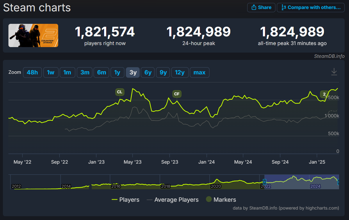 CS 2 побила рекорд CS:GO по пиковому онлайну – 1 824 989 игроков