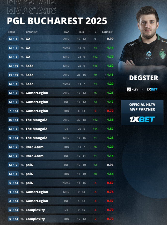 Абдул «degster» Гасанов стал лучшим игроком на PGL Bucharest. Он завершил чемпионат с рейтингом 1,12 [HLTV] за 21 карту.