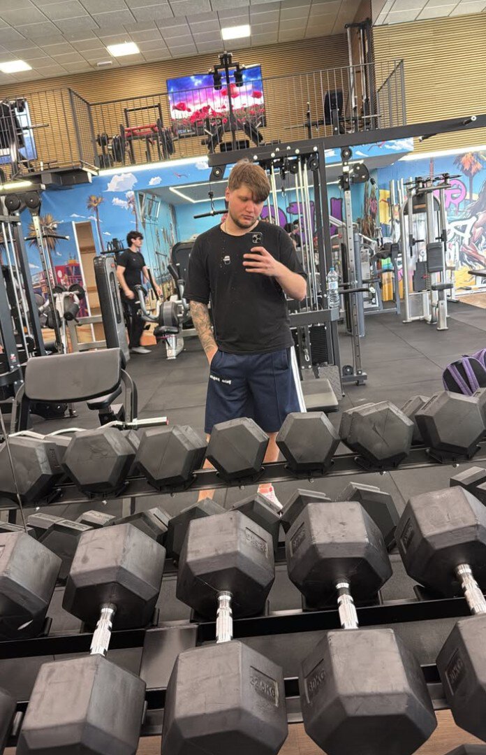 Александр «S1mple» Костылев опубликовал снимок из тренажерного зала. Он сфотографировался перед гантелями.