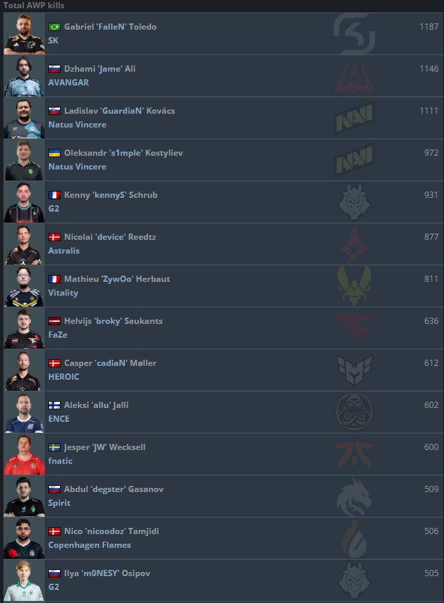 Первое место по количеству фрагов с AWP на мейджорах занимает Габриэль «FalleN» Толедо (1187). В топ-5 также вошли Джами «Jame» Али (1146), Ладислав «GuardiaN» Ковач (1111), Александр «S1mple» Костылев (972) и Кенни «kennyS» Шраб (931).