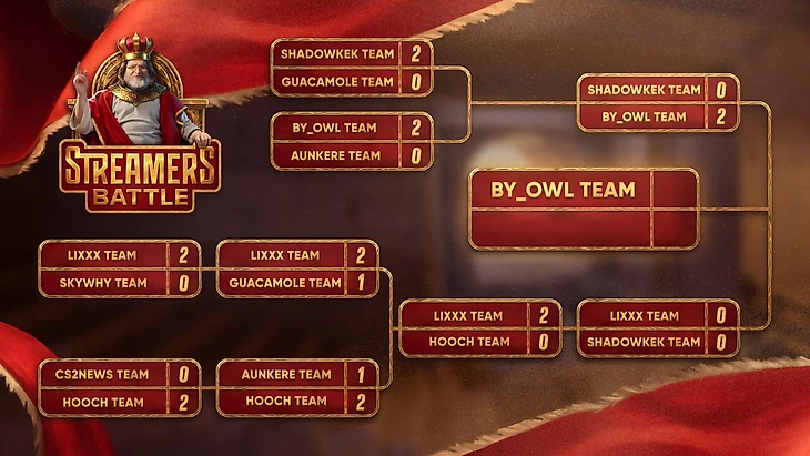 В плей-офф турнира сыграют 8 команд – Shadowkek Team, Skywhywalker Team, CS2NEWS Team, Hooch Team, Aunkere Team, Lixxx Team, By_Owl Team, Guacamole Team.