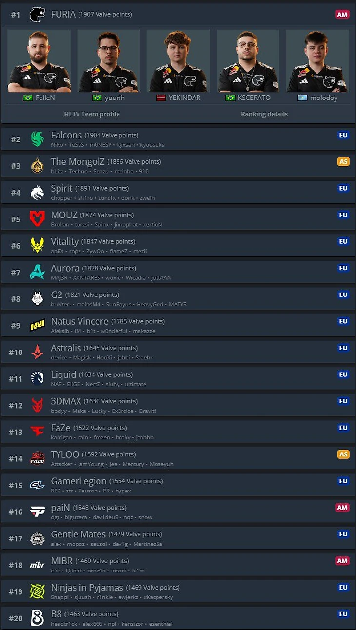 Вторую сточку в рейтинге занимают Falcons (1904 очка) с Ильей «M0nesy» Осиповым и Максимом «Kyousuke» Лукиным. В топ-5 также входят The Mongolz (1896 очков), Spirit (1892 очка) и Mouz (1874 очка).