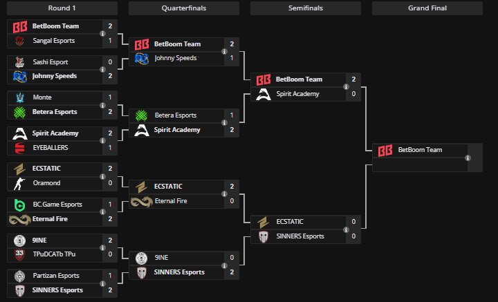 В 1/2 финала команда Кирилла «Boombl4» Михайлова оказалась сильнее Spirit Academy – 2-0. В параллельном финале между собой сыграют Ecstatic и Sinners – победитель встретится с BetBoom Team в финале.