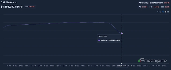 По данным Pricempire, капитализация рынка скинов 21 октября составляла 5,9 млрд долларов. После ночного обновления от 23 октября общая стоимость скинов упала на 1,3 млрд и теперь составляет 4,6 млрд долларов.