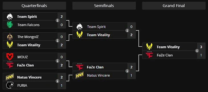Участники плей-офф: Spirit, Falcons, The Mongolz, Vitality, Mouz, Faze, NAVI, Furia.