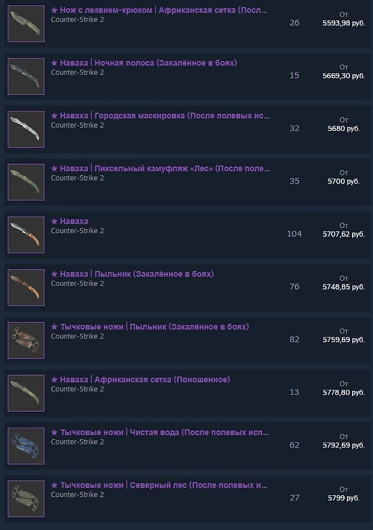 Спустя неделю после обновления пользователи получили возможность выставлять скрафченные ножи на торговую площадку. Цены на ножи остались примерно прежними, стоимость самого дешевого – 5593 рубля.