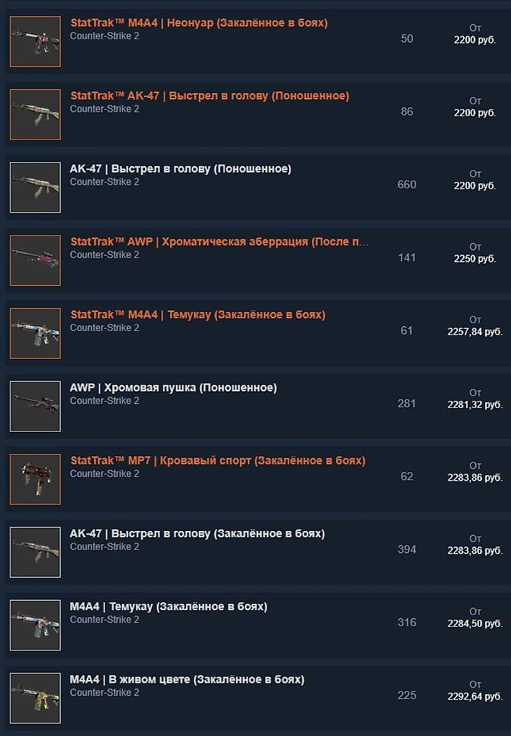 Цены на предметы редкости «Тайное» при этом упали, но с каждой минутой растут. StatTrak M4A4 «Неонуар» (Закаленное в боях), самое дешевое «тайное», стоит от 2200 рублей.