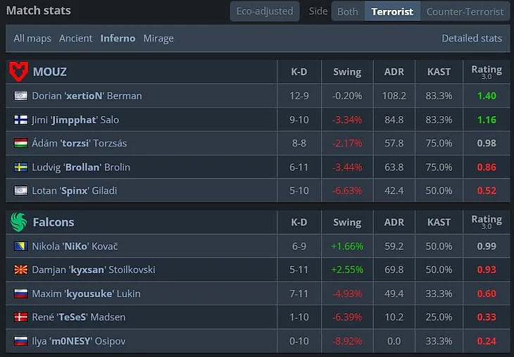Вторую половину Илья «M0nesy» Осипов закончил со счетом 0-11. За 12 раундов снайпер не нанес ни одной единицы урона. Итоговый счет Монеси на Inferno – 8-20.