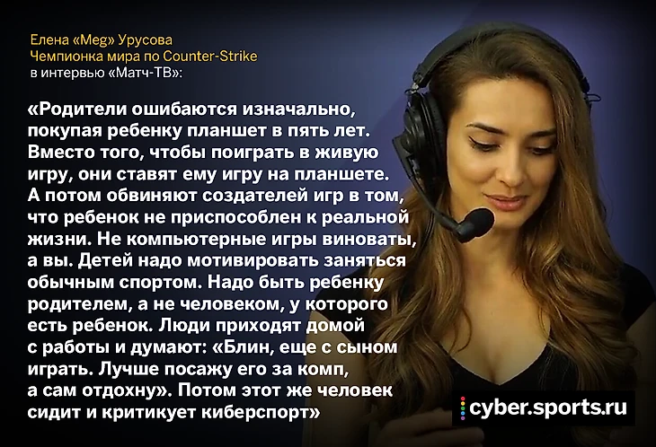 Одна из самых частых претензий к играм и киберспорту – дети, погружаясь в игры, забывают про интересы и развлечения в реальном мире. Елена «Meg» Урусова, играющая в Counter-Strike с 12 лет и выигравшая чемпионат мира объясняет: проблема совсем не в киберспорте.