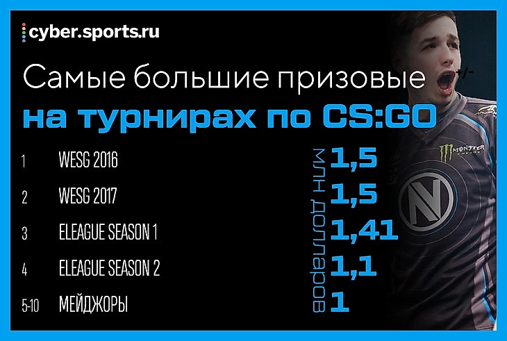Но даже мейджоры – не самые ценные турниры в CS:GO. Больше всех за последние два года получали победители WESG (Team Envyus в 2016 и Fnatic в 2017). Также внушительный призовой фонд предоставляет ELEAGUE: она вполне способна раздать более миллиона долларов и без поддержки Valve.