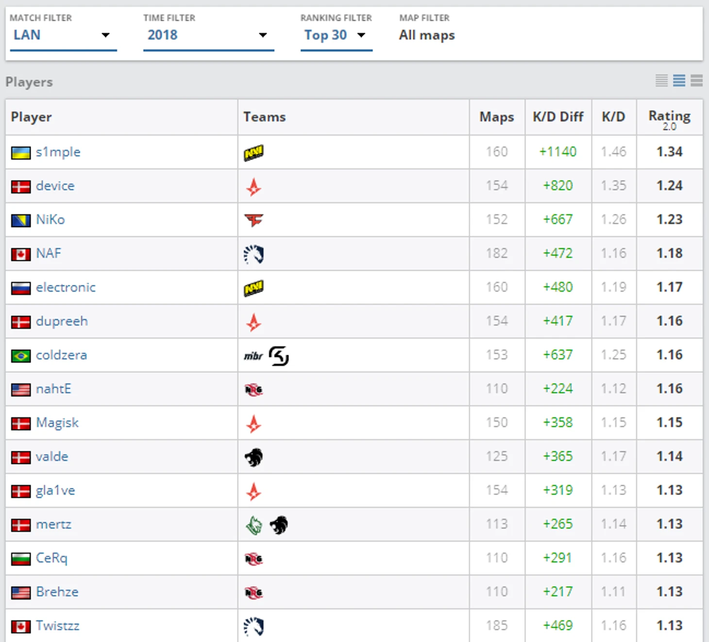 В первой половине года казалось, что у Симпла не очень хорошо получается играть против Astralis, так как только в матчах с датской командой у Костылева был отрицательный средний рейтинг за все время. Но затем Саша исправился: в то время, как рейтинг Девайса в матчах против Na`Vi равен лишь 1.07 (+24 K/D), s1mple в итоге показал в матчах с Astralis средний рейтинг 1.25 (+76 K/D).