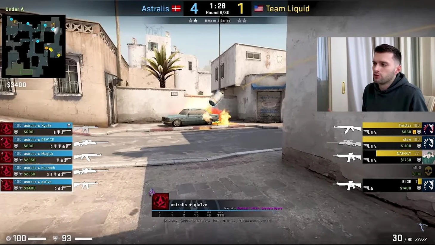 Игроки Astralis же не стеснялись использовать свои классические фишки с гранатами. Так, в это ситуации gla1ve решил смоком потушить коктейль молотова, который бросили игроки Team Liquid, хотя на той позиции не было никого из его тиммейтов. Это заставило североамериканцев задуматься, поэтому после этого они кинули на машину еще несколько гранат. В итоге Глейв обменял одну свою гранату на сразу несколько гранат от соперника. Гениально!