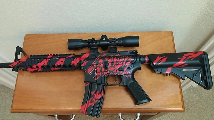 А вот это – оружие для страйкбола. С такой раскраской можно запугивать соперников еще до начала схватки.