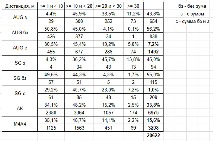Игроки с аугом, почти на 10% больше убивают на дистанции свыше 20 метров, чем игроки с М4 или АК. Зум действительно дает большое преимущество.