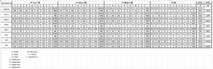 Как видно, распределение попаданий в тело почти одинаковое, везде прыгает плюс минус 1-2 процента. А вот соотношение всех выстрелов к выстрелам которые попали в тело интересное. У М4 и Ауга оно одинаковое, а у АК ситуация хуже, лишь 1 из 6.6 патронов долетает до своей цели. Дальше вы поймете почему это большой минус для АК, и почему Ауг, вероятно, сможет занять его место.