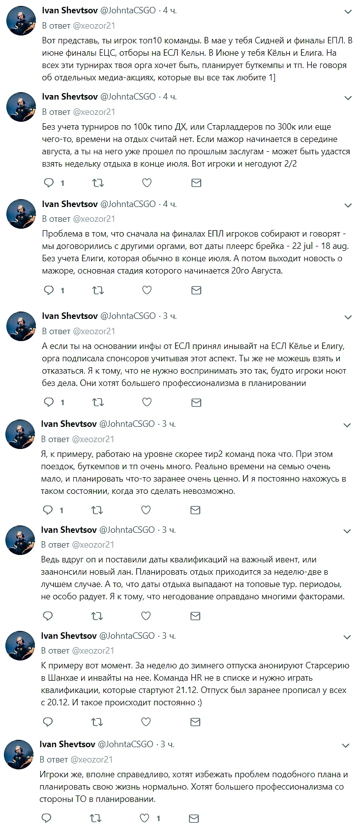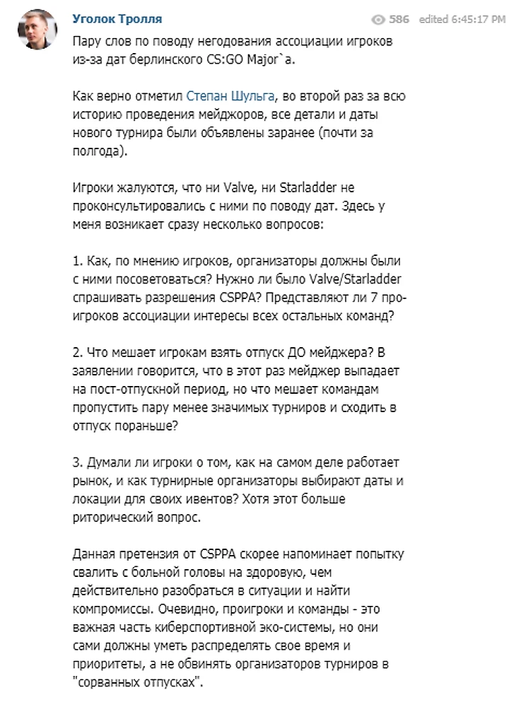 «CSPPA разочарован датой проведения следующего мейджора: он пройдет сразу после официального отпуска игроков. На нашей встрече с Valve на мейджоре в Лондоне мы объяснили, что, по мнению игроков, мейджоры должны проводиться в середине сезона или в конце».