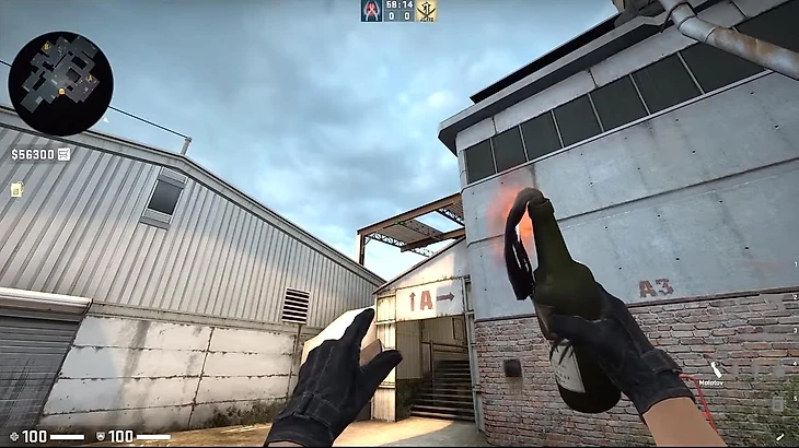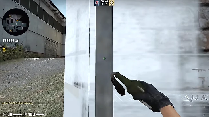 Если вы не хотите рисковать, то можете попробовать более сейвовую раскидку этого молотова. Для начала нужно навести прицел на середину трубы, расположенной около входа в ангар.