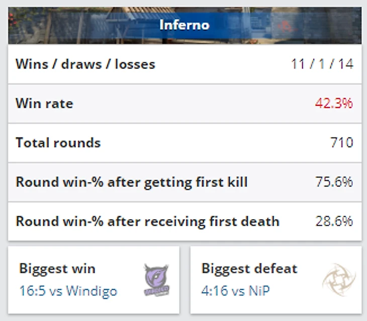 Да и пик Inferno от Faze Clan выглядел не самым очевидным мувом. Особенно учитывая статистику команды за последние 6 месяцев, по которой можно понять, что Inferno – худшая карта Faze после Overpass. Винрейт команды на этой карте – лишь 42 процента.