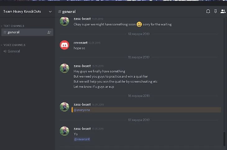 Судя по всему, команда использовала читы в тех матчах, когда букмекеры давали на нее высокий коэффициент. Это подтверждается скриншотом с Discord-сервера команды, где некий «Zazu-beast» собирается помочь Heavy Knockout с читами.