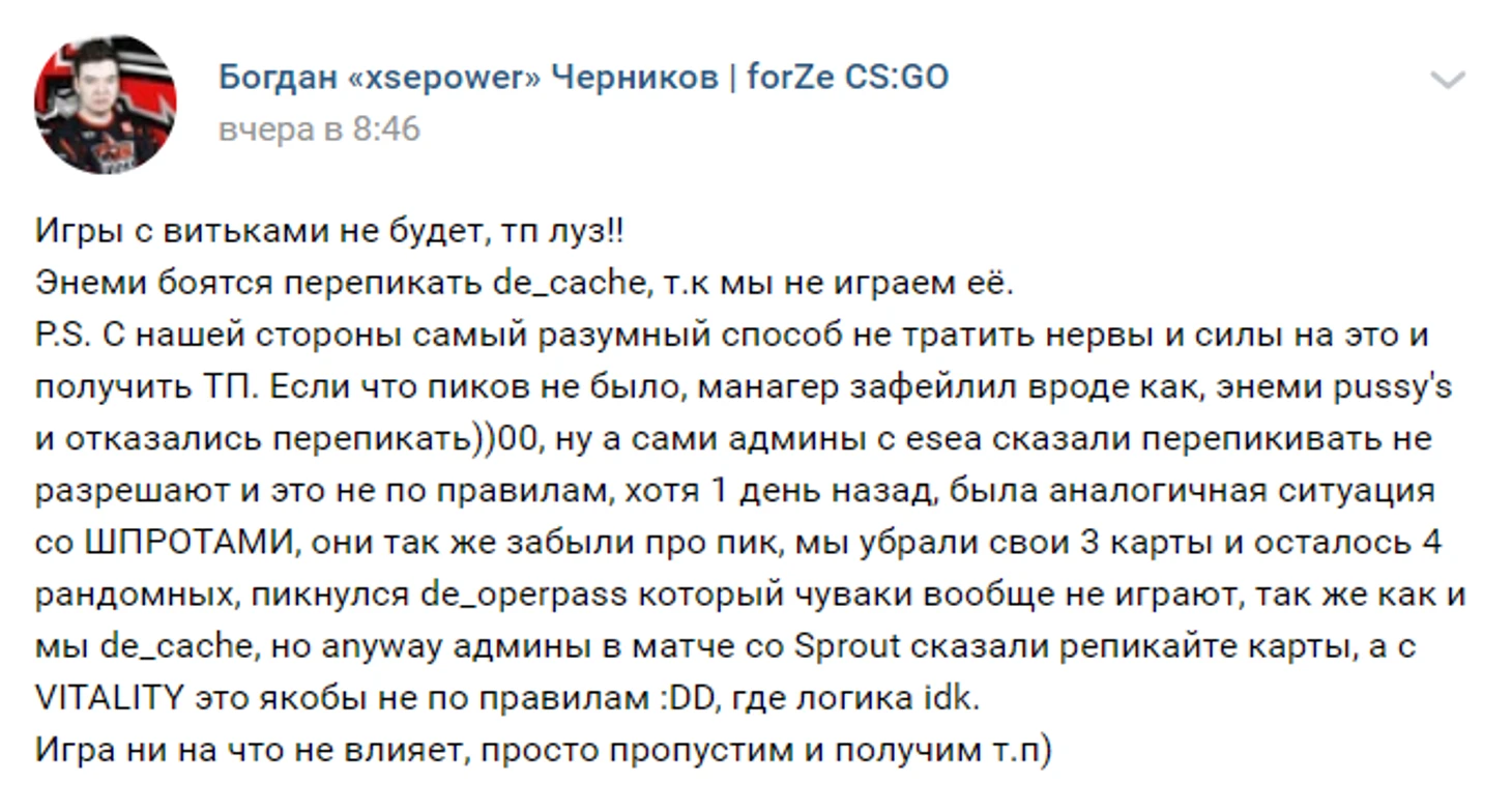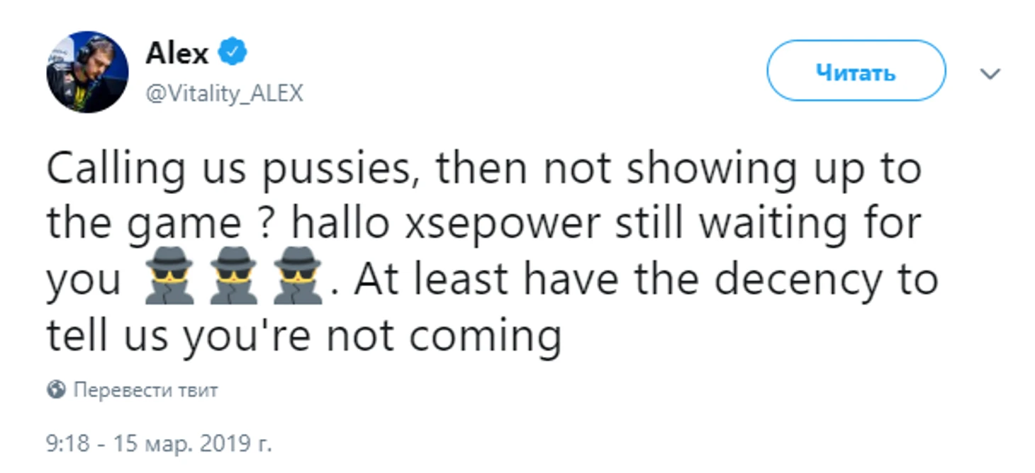 «Называешь нас pussies, а потом не приходишь на игру? Эй, xsepower, мы все еще ждем. Хотя бы побудь вежливым и скажи, что вы не придете».