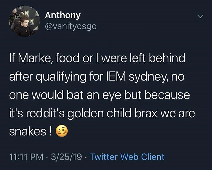«Если бы кто-то кинул MarKE, food или меня после прохода на IEM Sydney, то всем было бы наплевать. Но теперь все называют нас крысами, лишь потому что мы оставили Свэга – золотого ребенка Реддита».