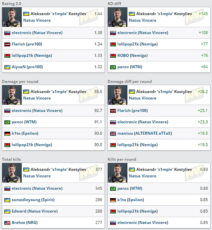 В каждом отдельном матче (если не считать недоразумения на первой карте Na`Vi на турнире) s1mple выдавал огненный перформанс. Он заканчивал карту с положительным рейтингом, когда Na`Vi без шансов проигрывали ее (8:16 против Renegades – рейтинг Симпла 1,53; 7:16 против Vici – рейтинг Симпла 1,5).