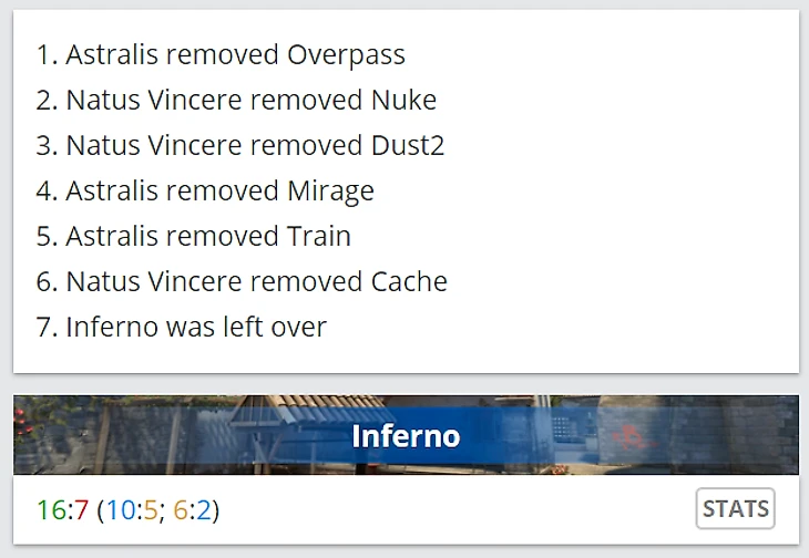 Na`Vi понимали, что их маппул в матчах с Astralis очень слаб, поэтому решили рискнуть и заставить датчан самих забанить Cache. Не получилось. Команда Девайса понимала, что для того, чтобы обеспечить себе комфортную карту, необходимо просто вычеркнуть Overpass, Mirage и Train, где у Na`Vi объективно могли быть шансы. Датчане так и поступили, из-за чего оставили Na`Vi перед непростым выбором в конце драфта – Cache или Inferno.