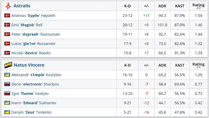 И поэтому Na`Vi все еще очень далеко до команды уровня Astralis. Только посмотрите на послематчевую статистику: российская пара сыграла не самым лучшим образом, а харьковский дуэт, так и вовсе провалился (0.42 рейтинг у Зевса и Эдварда).