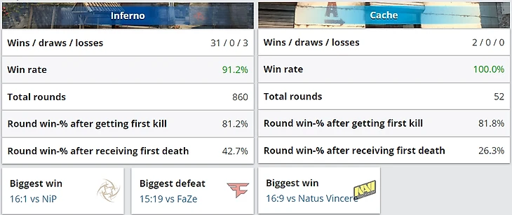 Зевс и Кейн решили не рисковать и сыграть на Inferno, и это решение – достаточно спорное. Стоит лишь посмотреть на винрейт Astralis на Inferno за последние 6 месяцев, и станет понятно, что датчане любят эту карту и готовы сыграть на ней с любым соперником. Да, Na`Vi не играют Cache от слова «совсем», но конкретно в этой ситуации парням было бы лучше рискнуть и вычеркнуть Inferno.