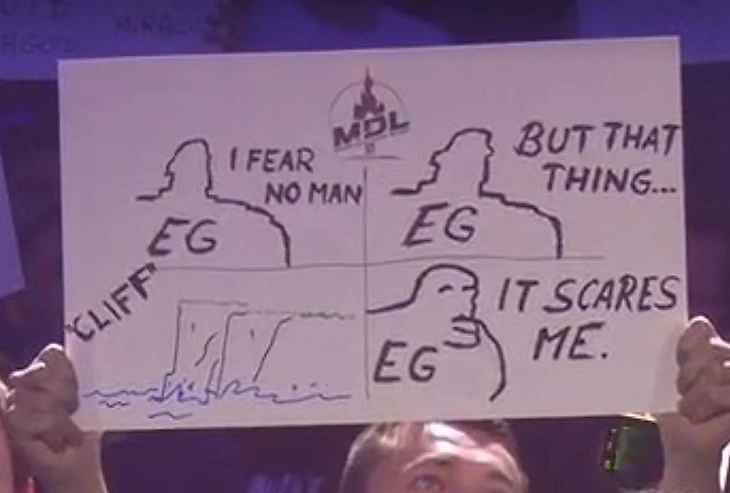 Почти весь киберспорт рос вокруг стриминговой платформы Twitch, и болельщики привыкли проявлять себя в онлайне – мемами на реддите и смайлами в чате Twitch. Мемы выходят и в оффлайн – десятки смешных постеров в зале попадают на трансляцию. Вот, например, парень на мейджоре по Доте иронизирует над тем, что игроки EG регулярно застревают на холме и проигрывают из-за этого.