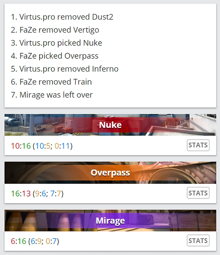 Наиболее интересна последняя фаза банов. Virtus.pro не захотели играть Inferno, а Faze решила избавиться от Train и оставить третьей картой Mirage. На первый взгляд этот мув выглядит очень странно: винрейт Faze на обеих картах одинаковый, но статистика VP на Train гораздо хуже, чем на Mirage. К тому же Мираж традиционно является одной из сильнейших карт поляков, которая спасала их во многих финалах.