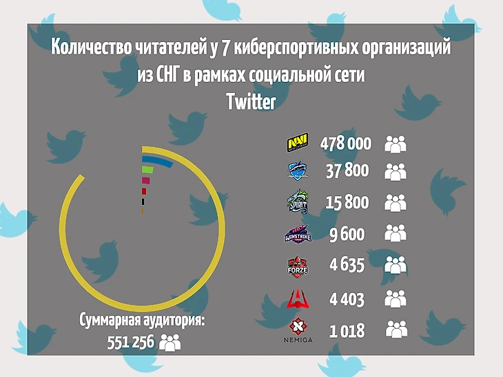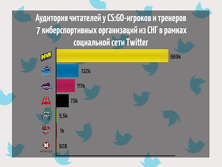 График аудитории читателей у CS:GO игроков и тренеров семи киберспортивных организаций из СНГ в рамках социальной сети Twitter.