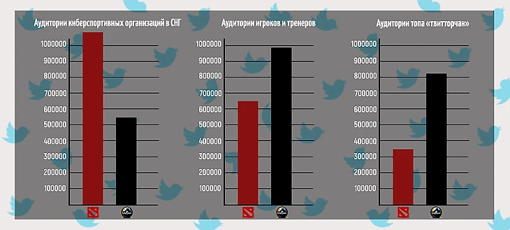 И это окончательно подтверждает график по топ «твитторчанам». Общая аудитория самых медийных игроков в рамках Twitter: у CS:GO - 826 700 читателей, у Dota 2 - 353 400 читателей.