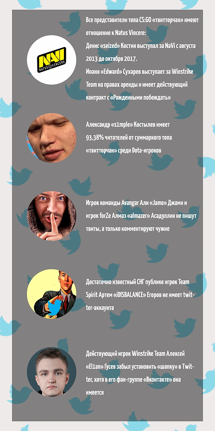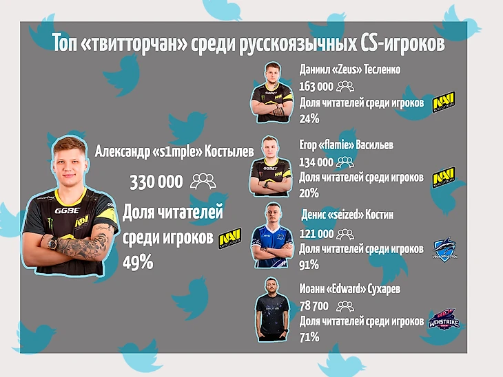 Разрывает топ «твитторчан» один из лучших игроков современного Counter Strike Александр s1mple Костылев, следом за ним идут два сокомандника: бессменный капитан Даниил Zeus Тесленко и Егор flamie Васильев. На четвертом месте расположился мастер резки арбуза Денис seized Костин и замыкает топ-5 «pistol king» Иоанн Edward Сухарев.
