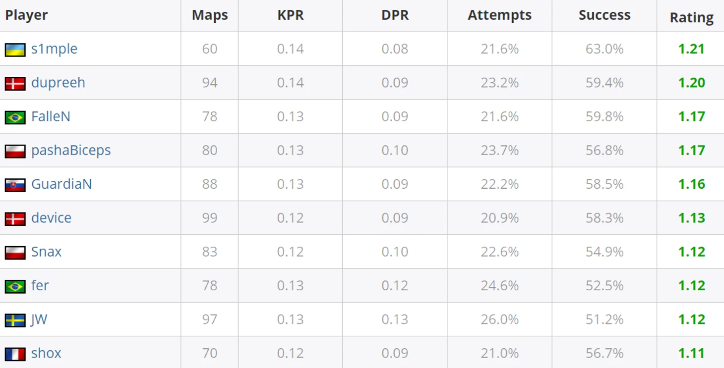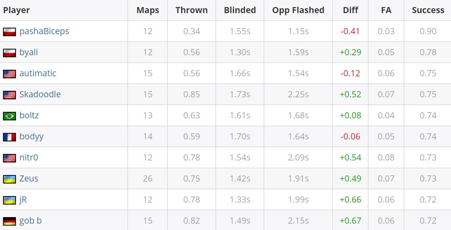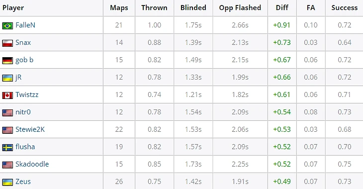 Не менее важной является разница между ослепленными противниками и временем, проведенном в ослеплении. Здесь первую строчку занимает старина FalleN. Он умеет не только хорошо флэшить соперников, но и вовремя доджить чужие гранаты – отличное качество для капитана и снайпера.