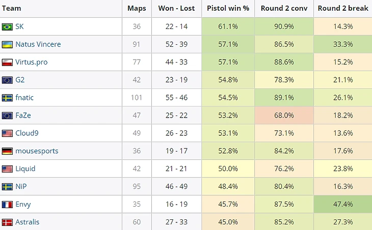 В защите сильнее всех на пистолетах остается SK Gaming. За всю историю мейджоров бразильцы выиграли 61% пистолетных раундов и не отдали 91% форс-баев соперников. Потрясающая статистика для мейджоров, на которых нередко срабатывают неполные закупки от соперников после проигранной пистолетки.