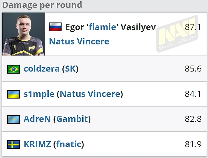 Не поверите, но существует показатель, в котором первую позицию занимает не Симпл и не Колдзира. Flamie обошел обоих по среднему количеству урона по соперникам за раунд. Мы знаем, что на мейджорах Егор всегда хорошо выступает, и статистика это только подтверждает. 87,1 урона за раунд – очень крутой результат, учитывая, что по среднему рейтингу Флейми лишь шестой.