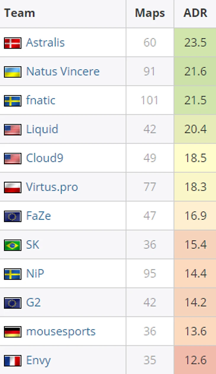Лидер в этом показателе не должен стать сюрпризом. За последние несколько лет Astralis доказала, что при правильном использовании гранатами можно наносить нереальное количество урона. За раунд на мейджорах датчане наносили в среднем 23,5 урона с помощью осколочных гранат и коктейлей молотова. Второе место – за NaVi.