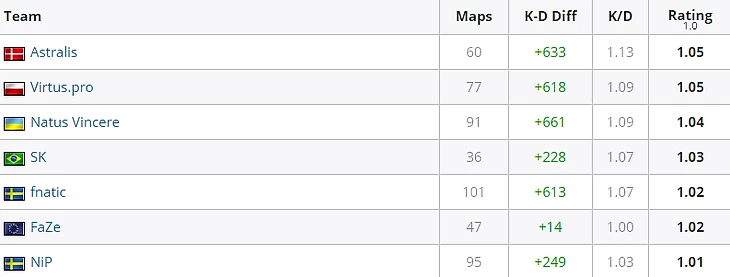 Хотя Device и занял лишь третье место по рейтингу на мейджорах среди игроков, его команда лидирует в списке лучших составов на мейджорах. Долгое время первую строчку удерживала Virtus.pro, но сейчас Astralis имеет возможность вырваться вперед. У NaVi общекомандный рейтинг равен 1.04 – это третий результат в мире.