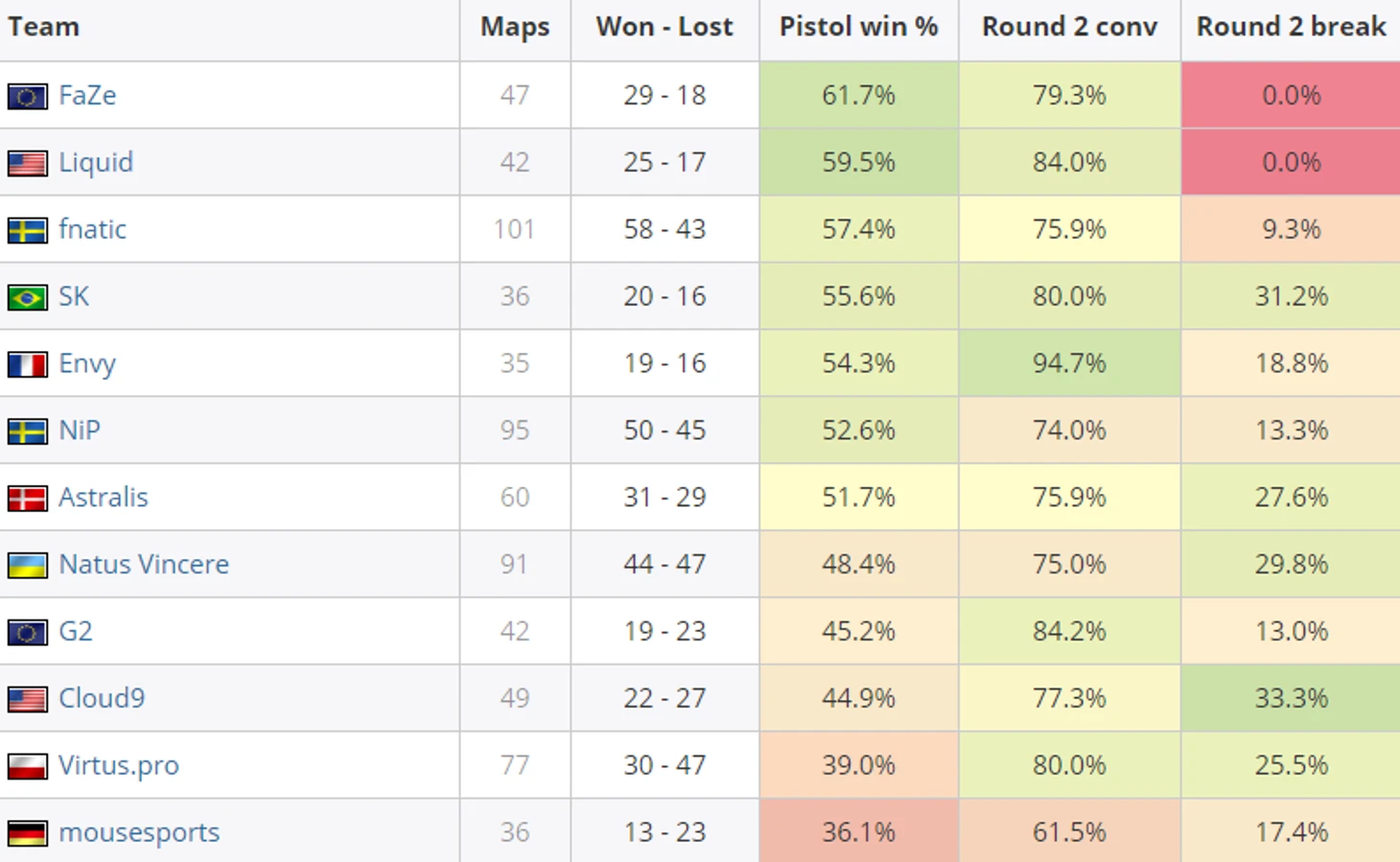 Но в атаке Natus Vincere далеко не так хороши – 48,4% взятых пистолеток за террористов против 57% за спецназ. Интересно, что лидируют по этому показателю Faze Clan и Team Liquid – команды с очень сильными игроками, но без хорошей тактической выучки. Еще забавнее, что ни Faze, ни Liquid еще не выигрывали форс-бай после проигранной пистолетки за атаку на мейджоре.