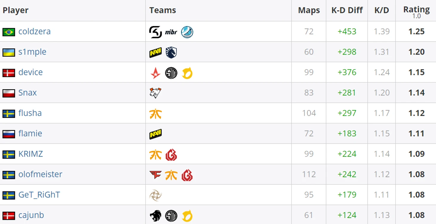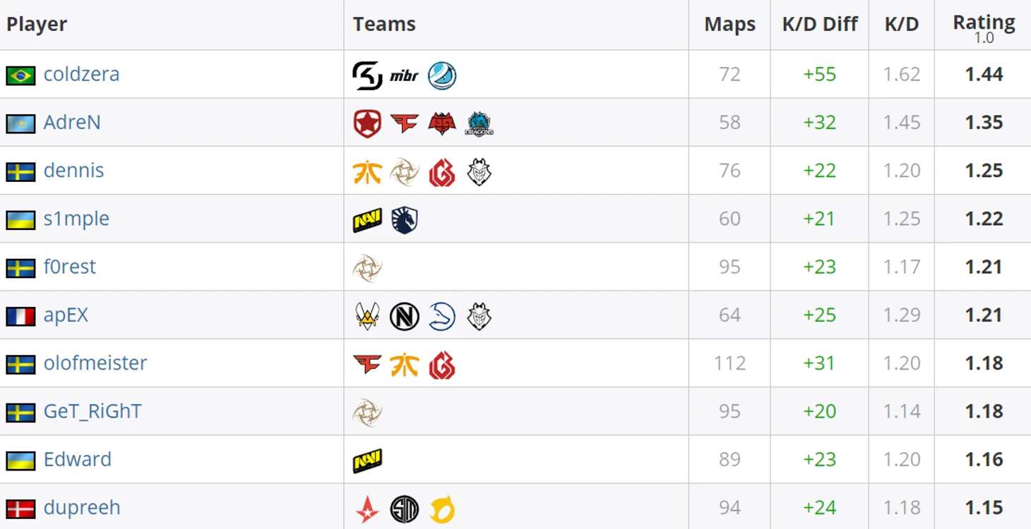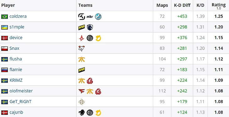 По этому показателю равных нет Колдзире и Симплу – это два самых стабильных игрока за всю историю мейджоров, которые значительно обходят остальных претендентов. Бразилец опережает Симпла и по количеству матчей, и по соотношению убийств/смертей, и по среднему рейтингу (1.25 против 1.20).