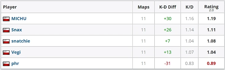 Если MICHU играл стабильно даже в сложнейшие для VP времена, то Snax заметно сдал за последний год – из одного из самых зрелищных игроков в истории он превратился в обычного стрелка с рейтингом 1,0. К счастью, на этом турнире Януш снова раскрылся и выиграл для команды немало важных раундов. Например, последний раунд полуфинала, который спас Virtus.pro от овертайма.