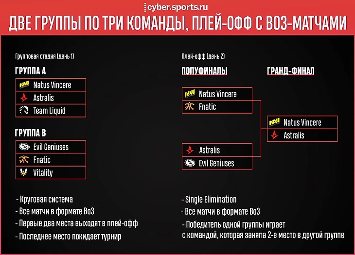 Две группы по 3 команды в каждой, затем плей-офф с Bo3-полуфиналами.