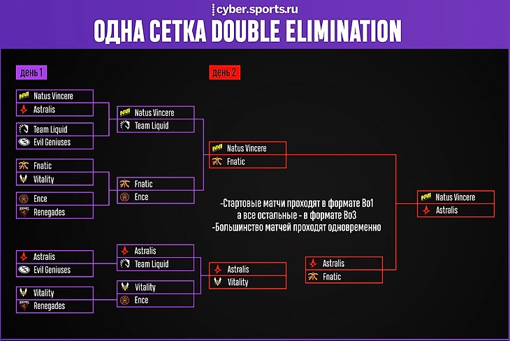 В итоге мы получаем многими любимую систему Double Elimination, большое количество команд, разнообразие и много Bo3-матчей. Единственный значимый минус этой системы – усталость команд. В худшем случае может получиться так, что одному из финалистов придется сыграть три матча в первый день и три матча во второй. С другой стороны, это лишь подстегивает команды выходить в финал по верхней сетке, чтобы сэкономить время и силы.