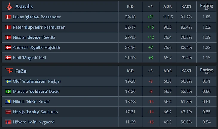 На таблице с общим счетом за матч – тотальное превосходство датчан. Ни один игрок Faze Clan за две карты не набрал даже 20 фрагов, такое происходит крайне редко.