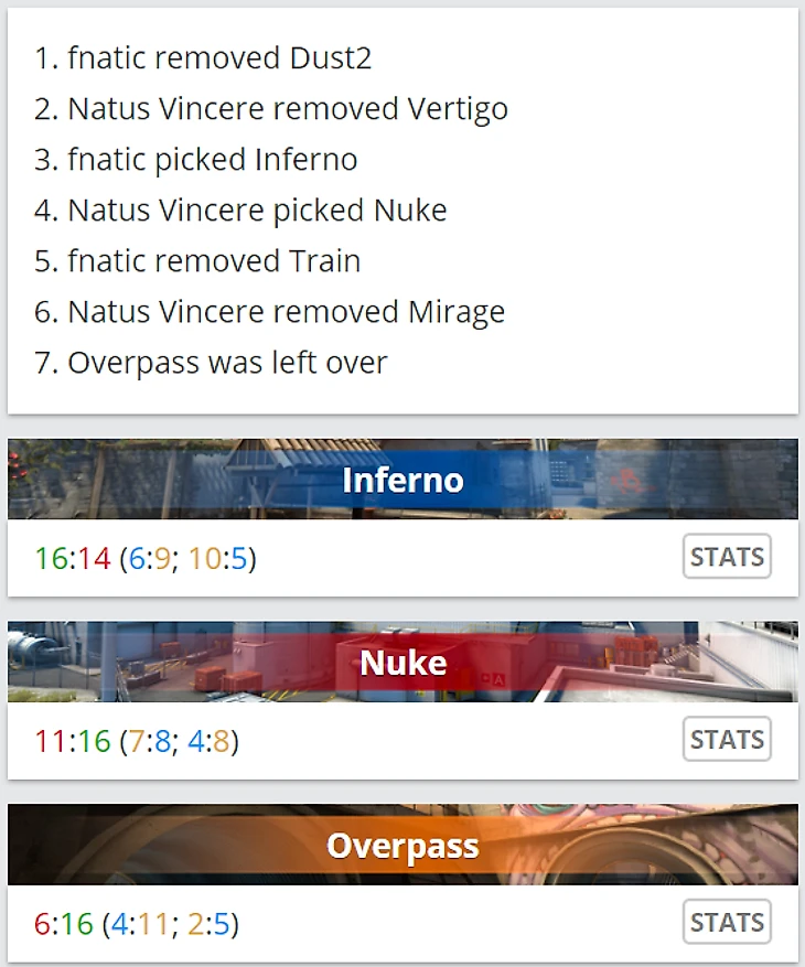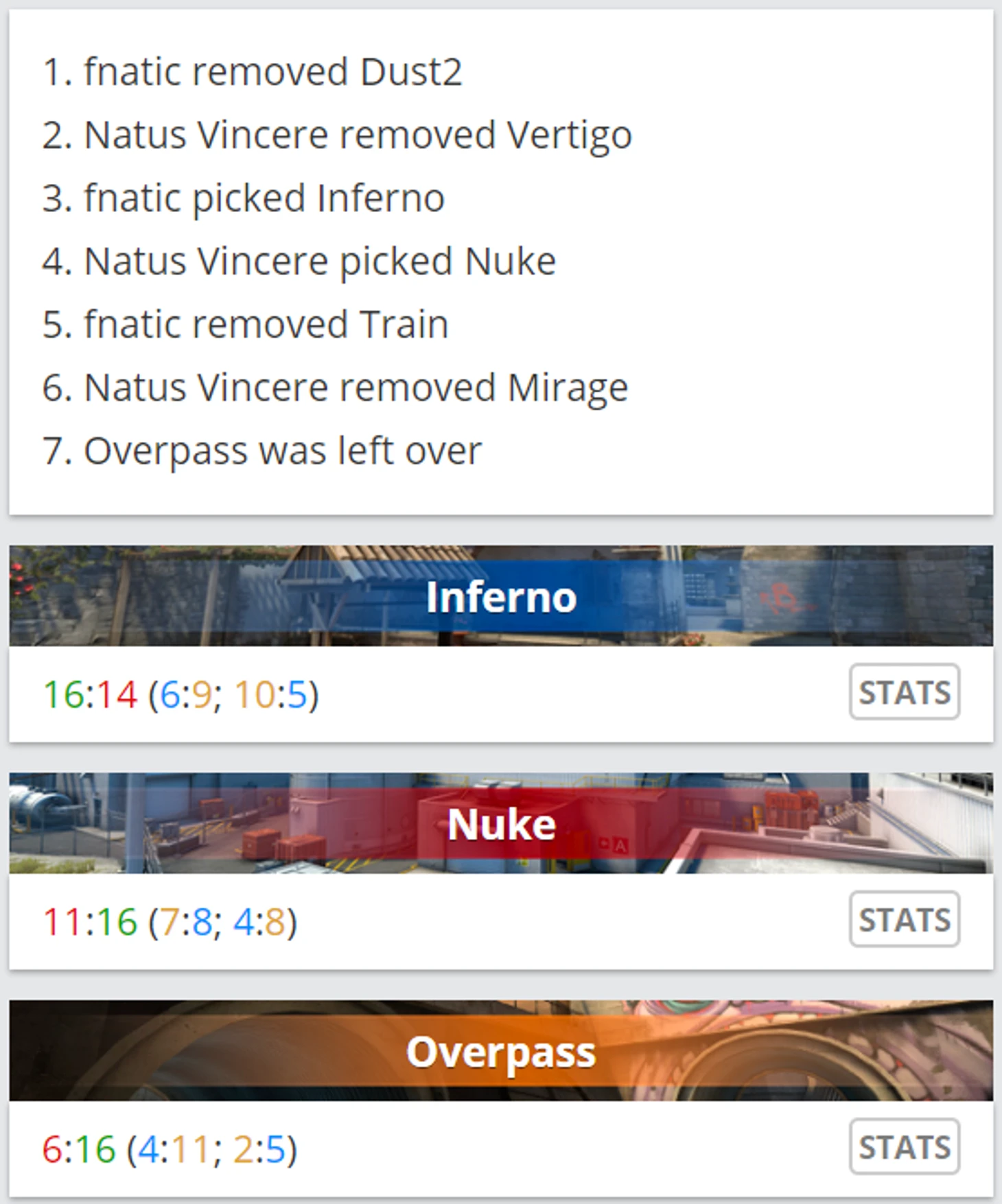 Исходя из предпочтений обеих команд, предсказать карты полуфинала можно было еще до драфта. NAVI избавились от Vertigo, а Fnatic – от Dust2. СНГ-команда захотела сыграть на Nuke, и это решение можно понять, исходя от нестабильных результатов шведов на этой карте. Бан Mirage от NAVI в третьей фазе драфта тоже был ожидаемым: у команды Симпла в последние 6 месяцев не получается играть на ней (лишь 2 победы из 7).